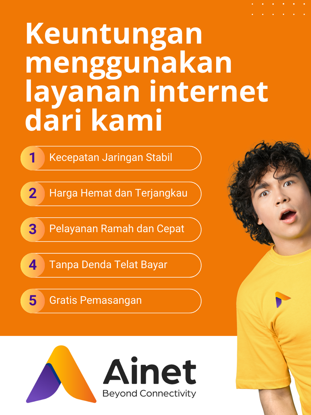 Ainet adalah layanan internet yang di rancang untuk menjaga bisnis dan rumah Anda selalu terhubung-stabil, cepat, dan tepat tanpa ribet.
